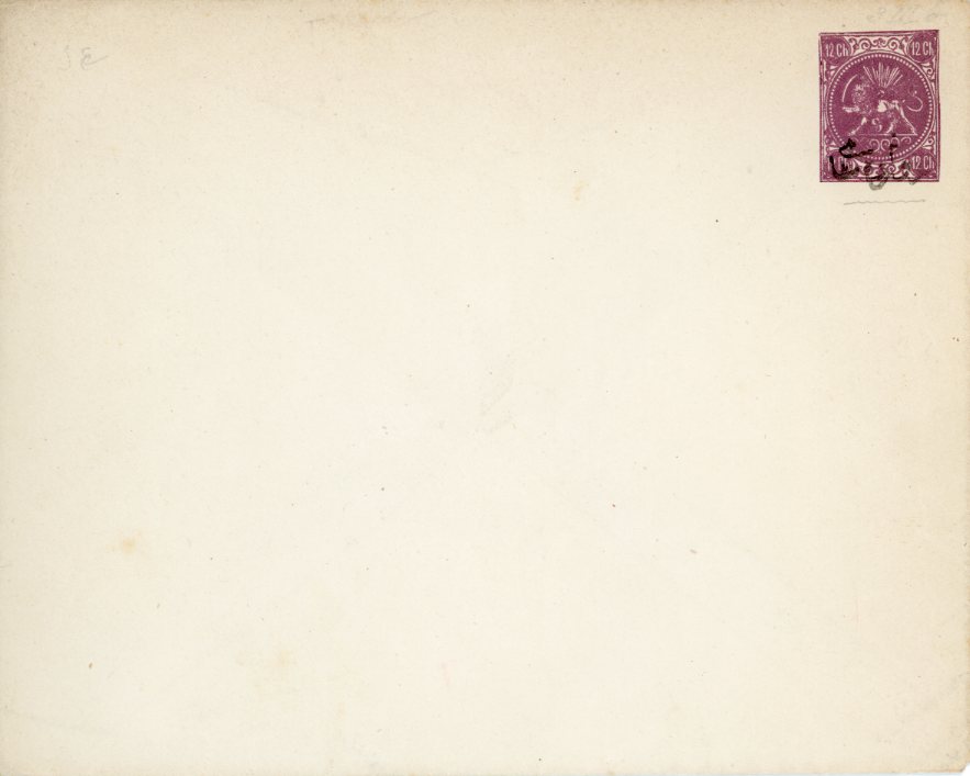 Iran: 1877 handstamp type B 12ch Lion unused postal stationery envelope (150 x 120 mm).