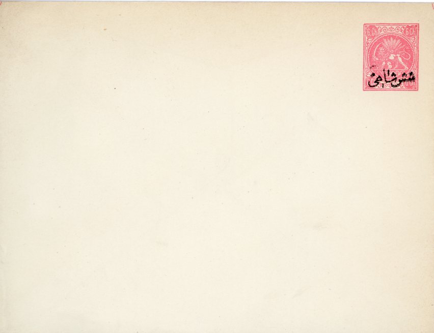 Iran: 1877 unused 6ch (145 x 111 mm) handstamped Lion postal stationery envelope.