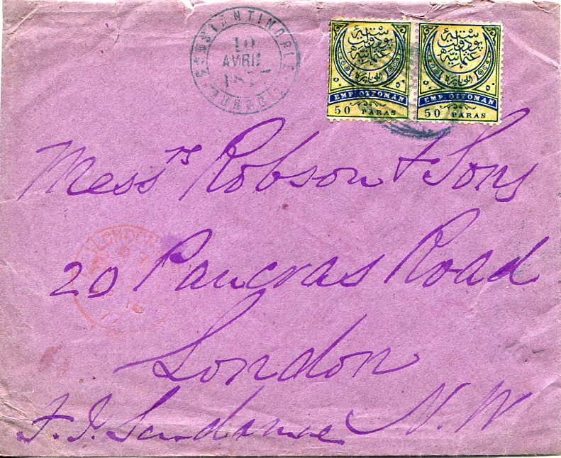 Ottoman Turkey: 1877 (10 April). Cover to England franked with pair of 50pa UPU Empire stamps for double weight rate tied by PIO handstamp and Constantinople datestamp alongside red 16 April London PAID cds. Very few recorded rare double weight solo usage of 50pa stamps. Exhibition item.