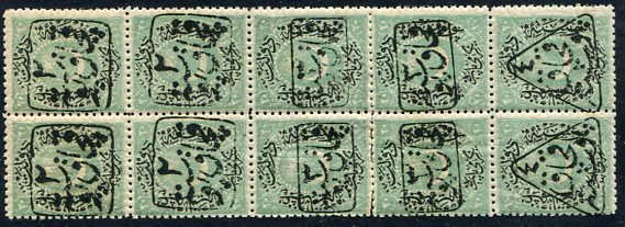 Ottoman Turkey: 1877 (May) issue 20pa Dulos issue mint o.g. block of ten with three different type of black Kaçak (contraband) handstamps. These stamps are affixed on the post without franking carried in Istanbul Steamer Lines.