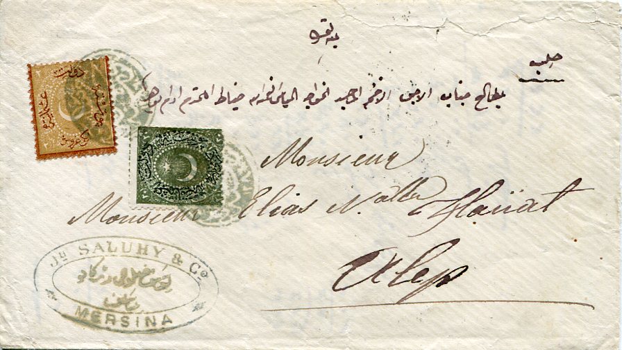 Ottoman Turkey: circa 1877 cover to Aleppo franked with Dulos type 2pi perf. 13 1/2 red-brown border postage due and 20pa of 1877 stamps for 2 1/2 piastres single weight combined 1pi littoral and 1 1/2pi up to 100 route-hours overland rate tied by POSTAHANE-I MERSIN 1286 [1870] (vilayet Adana, A&P type 2, RRR) negative seal and JH SALUHY & Co * MERSINA merchant cachet. Reverse Alep * Turquie arrival cds.