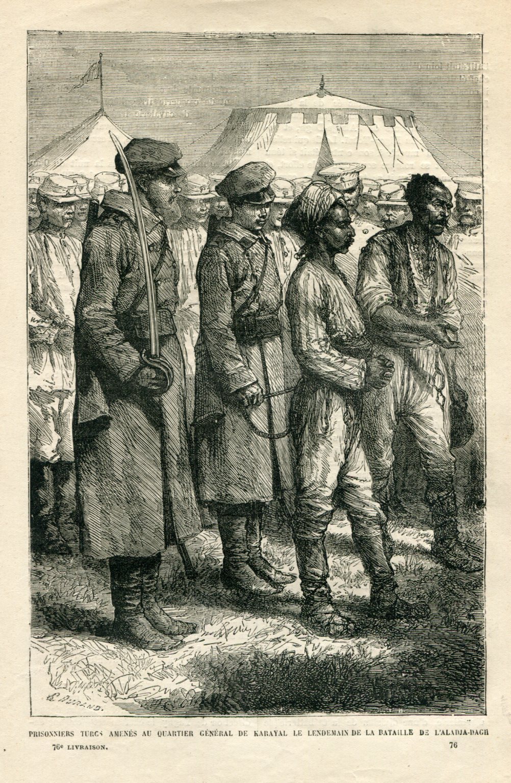 1878 gravure cut-out from La Guerre D’Orient titled ‘Prisonners turcs amenes au quarties general de Karayal le lendemain de la bataille de l’Aladja-Dagh’. Overall size 190 x 270mm.