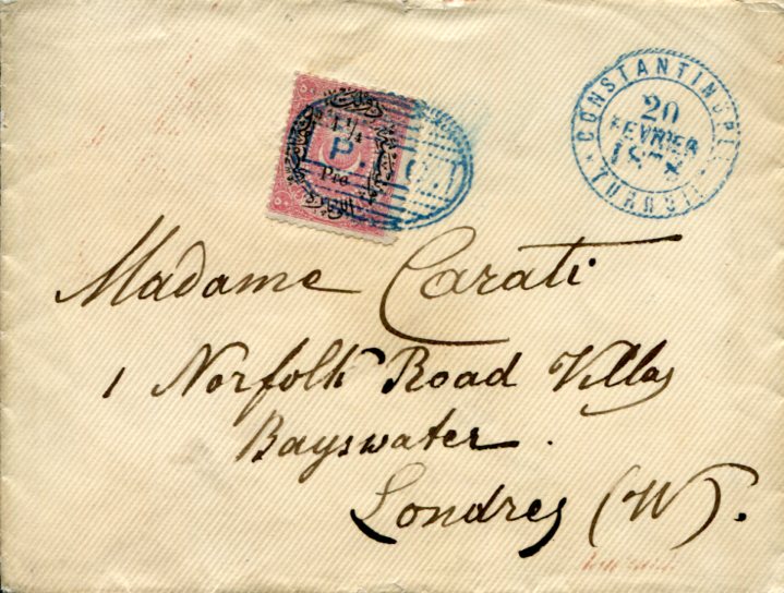 Ottoman Turkey: 1878 (20 February). Cover to London, England franked with 1 ¼pres on 50pa of 1876 Dulos stamps for fifty paras single weight international letter rate according to UPU regulations tied by P.I.O (Poste Imperiale Ottomane, A&P type 42) oval dumb handstamp alongside Constantinople & Turquie datestamp. Reverse 28 Fevruary arrival cds in red. Isfila 93