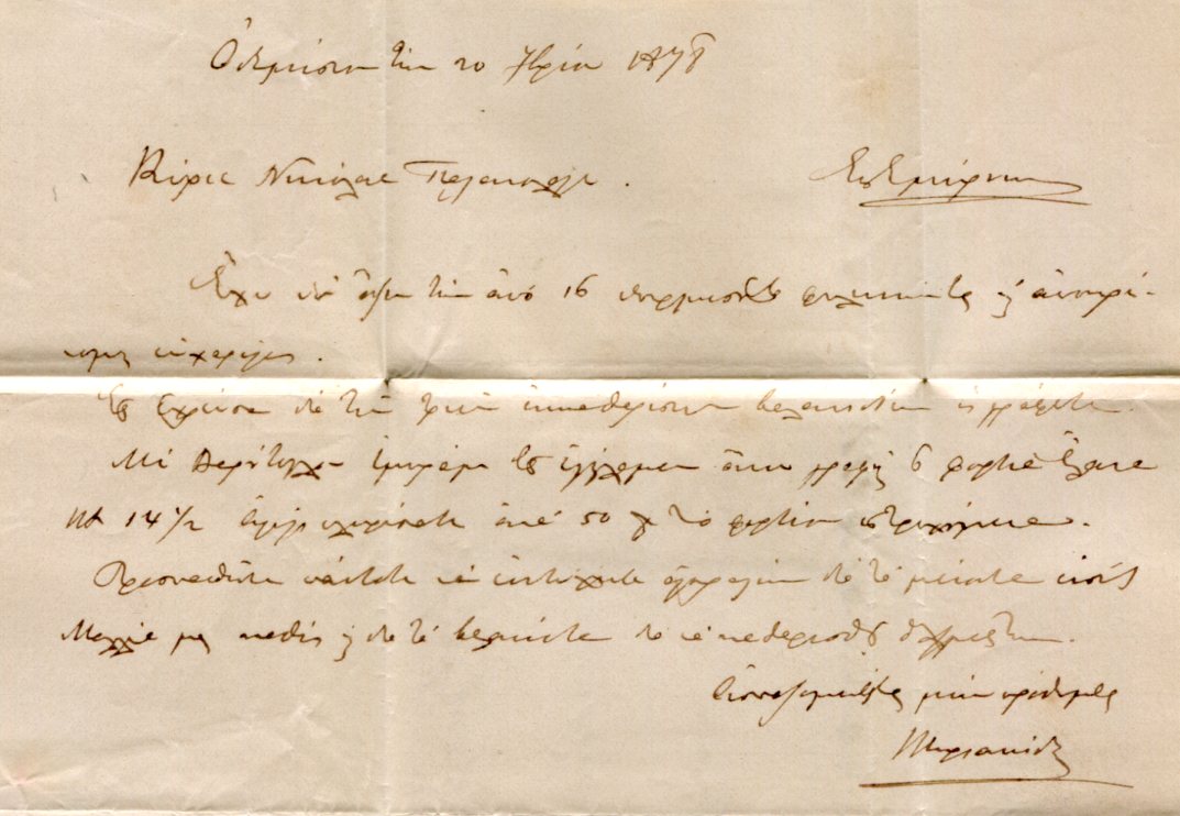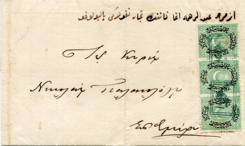 Ottoman Turkey: 1878 folded entire to Izmir franked with strip of three 20pa of 1877 Dulos stamps for 1 ½pi single weight up to 100 route hours rate tied by triple box KUŞADASI (vilayet Aydin, A&P type 1, RR) handstamps. Scarce solo franking.