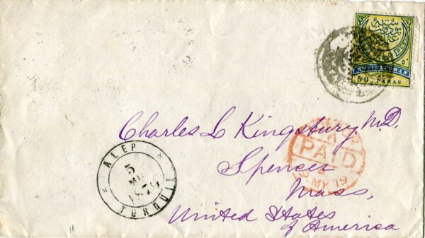 Türkiye: 1879 (May). Cover to United States franked with 50pa. for foreign letter rate tied by POSTAHANE-I MARAS SENE 1284 (TR #4296, A&P type 1, RR) negative seal, 5 May Alexandrette and Alep, 11 May Egyptian Alexandria, 19 May London transit and 30 May New York arrival cds’s.
