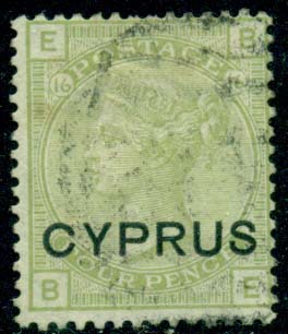 Cyprus: 1880 (1 April). Great Britain 4d. sage-green plate 16 overprinted Cyprus, fine used. SG 4