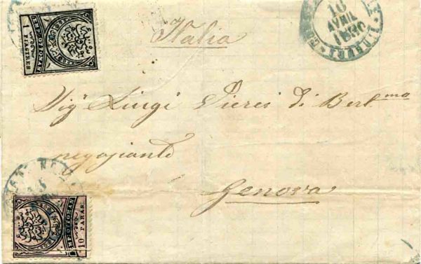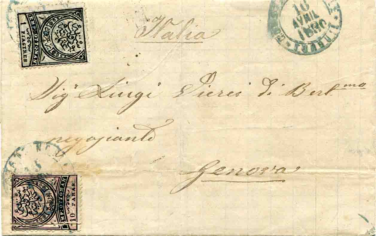 Ottoman Turkey: 1880 (16 April). Folded entire from Istanbul to Genoa, Italy franked with 10pa of 1876 and 1pi of 1889 UPU empire stamps tied by dispatch cds’s. Reverse 21 April arrival cds. 10pa has a unique paperfold error.