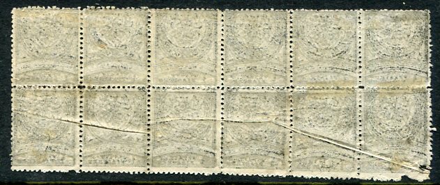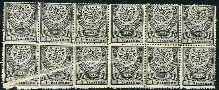 Ottoman Empire: 1880 (March). UPU Empire issue 1pi black and slate perf. 13 1/2 mint o.g. block of twelve with dramatic paperfold error. Isfila 111, Sg. 92