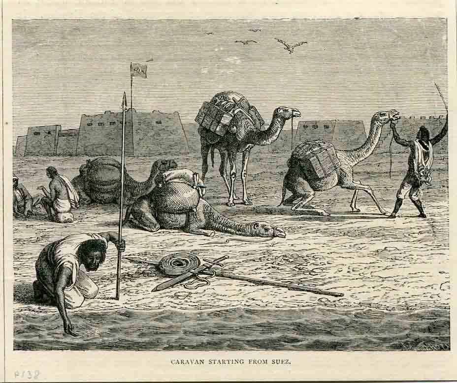 Egypt: 1880s gravure from the Land of Pharaohs titled “Caravan starting from Suez”. 161 x 134mm
