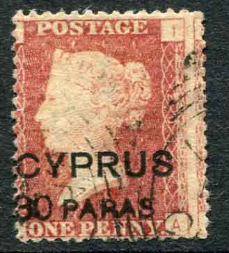 Cyprus: 1881 June). Great Britain QV 1d red letters IA – AI plate 201 overprinted CYPRUS and surcharged 30 PARAS struck with part Nicosia datestamp. Sg. 10