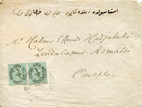 Ottoman Turkey: 1881 (January). Istanbul City Post cover franked with ‘Şehir’ (City) overprinted in black on 20pa of 1877 Dulos stamp for one piastre letter rate tied by bilingual Stamboul datestamp. Reverse 24 January Constantinople * Yeni-Djami (A&P type 1) arrival cds. ex. O. Hornung. Isfila YPO111