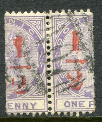 Dominica: 1882 (December). Vertically bisected and 1/2 surcharged in red on half 1d. used pair. Sg. 11