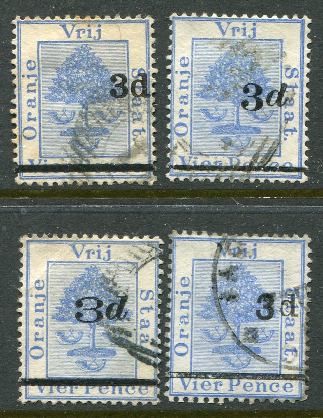 South Africa – Orange Free State: 1882. 3d. surcharged on 4d. ultramarine used types a, b, c and d. Sg. 38/41