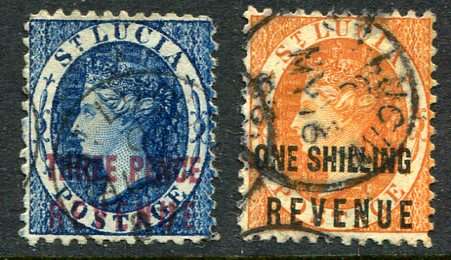 St. Lucia – Postal Fiscal Stamp: 1882 perf. 12 surcharged 3d. deep blue and 1s. orange struck by part datestamps. Sg. F19, F20