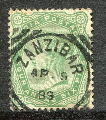 Zanzibar: 1882 India QV 4a.6p. yellow-green struck by type Z5 Zanzibar datestamp. Sg. Z70