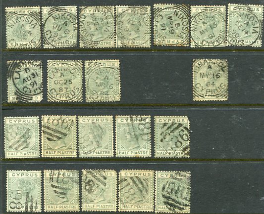 Cyprus: 1883 (April). Queen Victoria die I watermark CA 1/2pi dull green used selection of 21 with Nikosia, Larnaca, Limassol and “981” Paphos cancellations. Mixed condition. Sg. 16a