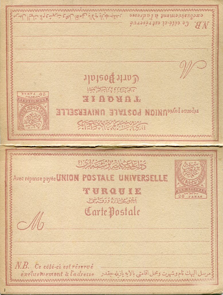 Ottoman Empire: 1884-91 UPU Empire type 20pa unused reply postal stationery card. Isfila AN26