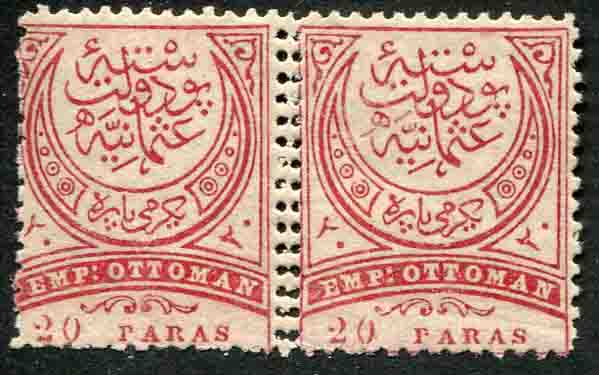 Ottoman: 1884 (13 May). UPU Empire 20pa mint o.g. perf. 13 1/4 pair with vertically double perforation variety. Isfila 116 DE06