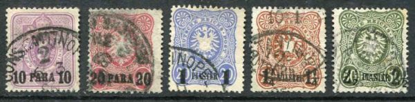German Levant: 1884 (25 January). Deutsche Reich-Post / Pfennig German stamps surcharged with Turkish values basic used set of five. Sg. 1/4, 6