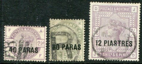 British Levant: 1885 (1 August)-88. Stamps of Queen Victoria of Great Britain surcharged by Turkish currency used set of three. Sg. 1/3a
