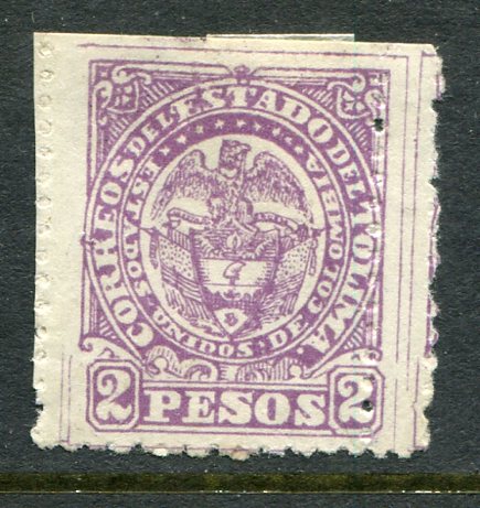 Colombia – Tolima: 1886 coat of arms 2 peso violet part imperf. mint o.g. Sc. 53. *