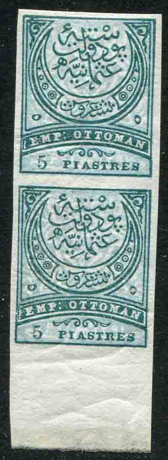 Türkiye: 1886 (1 April). UPU Empire 5pi marginal imperforate mint o.g. vertical pair. Isfila 127 DE11 *