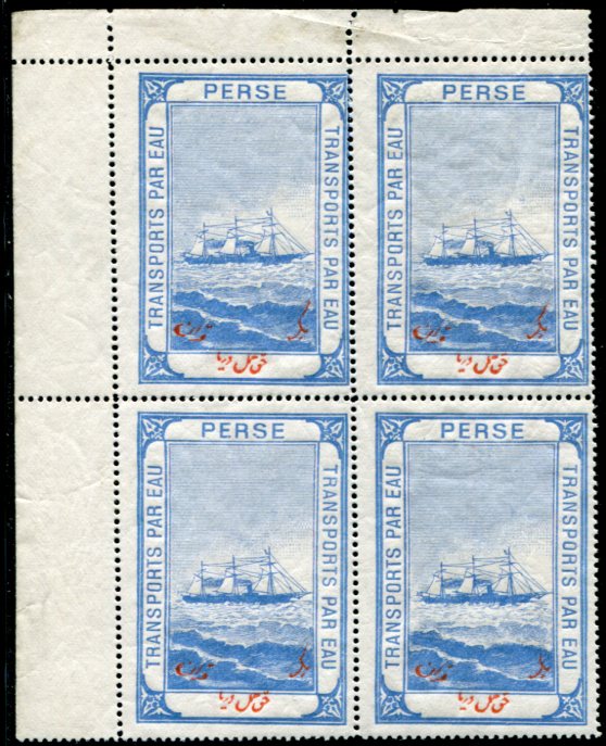 Iran: 1886 Transport Revenues unmounted mint marginal block of four 1Kr Sea Transportation. **