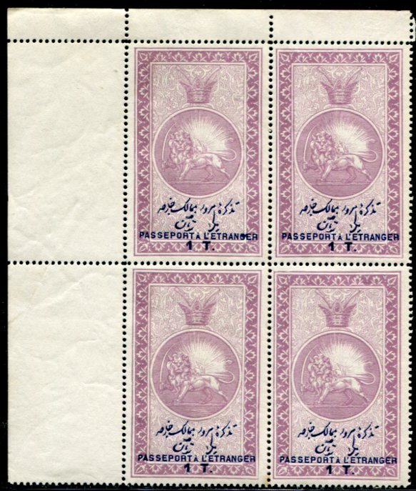 Iran: 1886 Passport Fee for travelling to the foreign countries 1 Toman unmounted mint marginal block of four. **