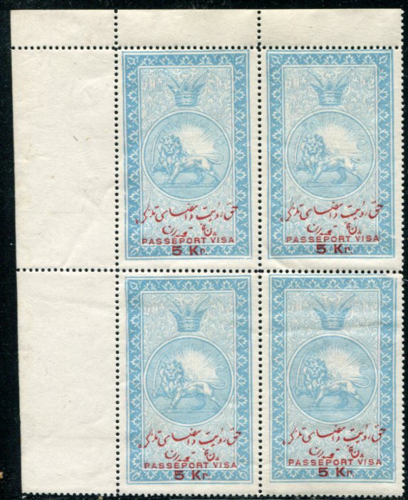 Iran: 1886 Passport Visa Revenue 5Kr unmounted mint marginal block of four. **