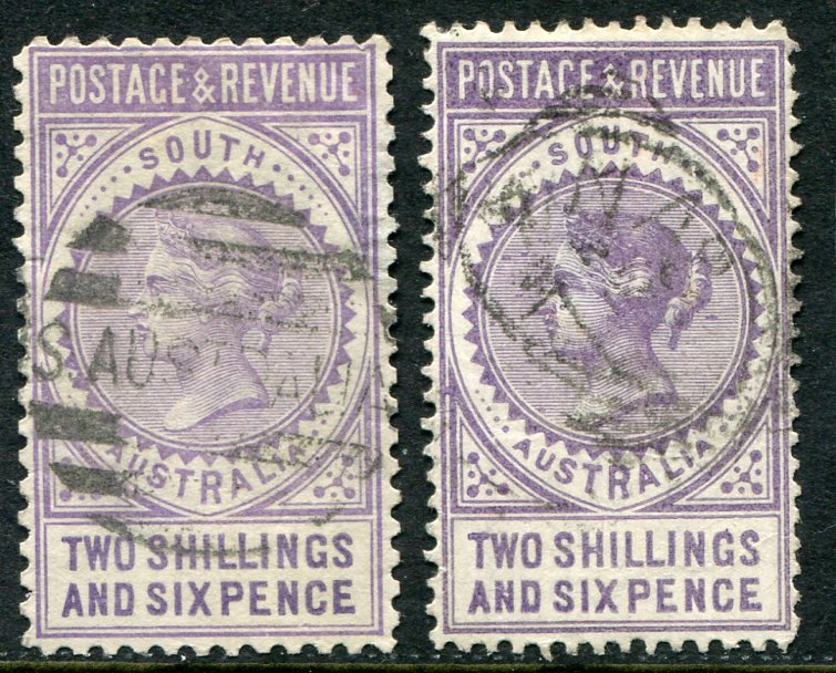 South Australia: 1886 (20 December). 2s.6d mauve perf. 10 and 2s.6d dull violet perf. 11 1/2 x 12 1/2 used. Sg. 195, 195a