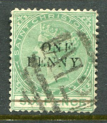 St. Kitts-Nevis – St. Christopher: 1886 (June). 6d. green surcharged ONE PENNY struck by part A12 handstamp. Sg. 24