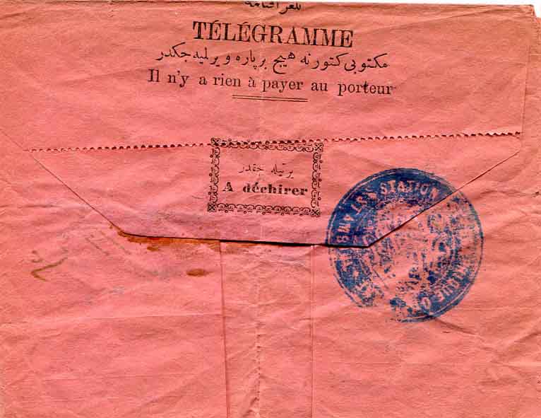 Ottoman Turkey: 1886 (30 September). telegraph used in Istanbul from Yildiz (Palace) to the Foreign Minister Said Pascha struck on arrival by STATION TELEGRAPHIQUE OTTOMANE * STAMBOUL (unrecorded by A&P) bilingual negative seal. Inside five lines message in French. Scarce