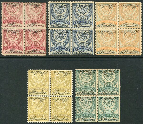 Ottoman Empire: 1887-88 UPU Empire issue un-perforated and surcharged 10pa to 2pi mint o.g. blocks of four collection. Isfila YPO190-YPO195 (between). *