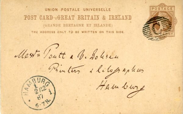 British Levant: 1887 One Penny postal stationery card to Germany struck by type Z2 ‘C’ Constantinople handstamp and 2 December Hamburg arrival cds. Reverse 29 November BPO Constantinople cds and MIHRAN ACHOD merchant hand cachet.