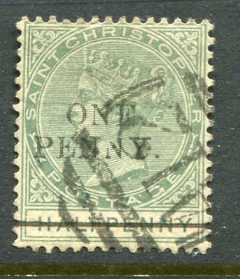 St. Kitts-Nevis – St. Christopher: 1887 (May). 2 1/2d. dull green surcharged ONE PENNY struck by part A12 handstamp. Sg. 26