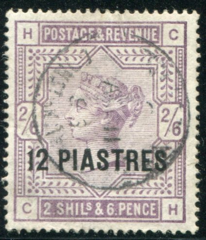 British Levant: 1888 (April). QV 2s6d lilac on white paper surcharged 12pi Turkish Currency struck by full BPO Constantinople 11 April 1896 datestamp. Sg. 3a
