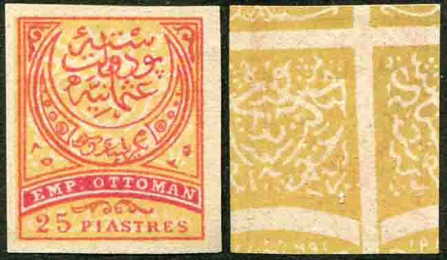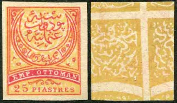 Türkiye: 1888 (13 March). UPU Empire 25pi imperforate, background design also on reverse. Unrecorded error.