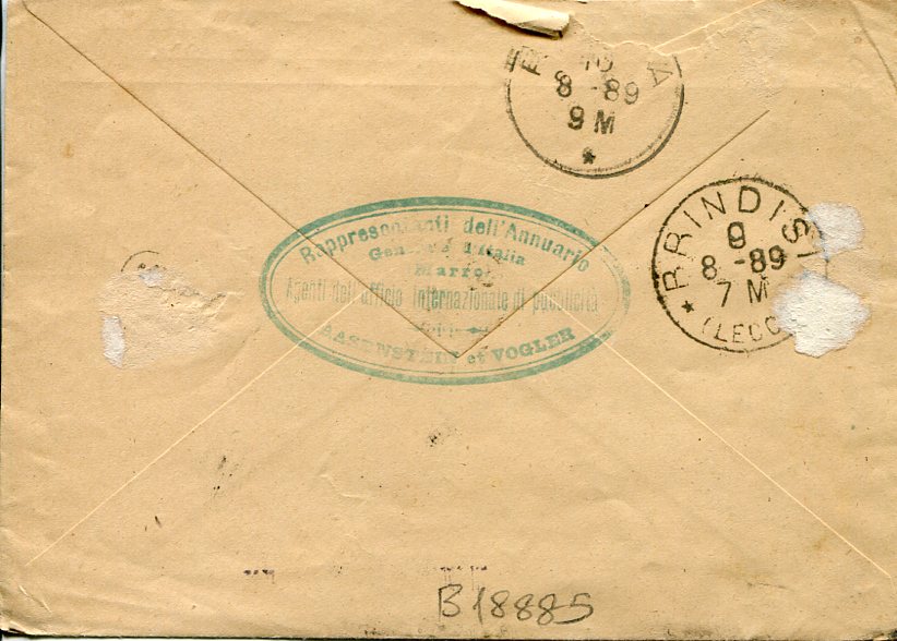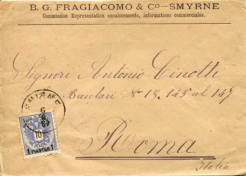 Austria Levant: 1889 (6 August). B.G. Fragiacomo & Co. – Smyrne imprinted cover to Italy franked with 1 Piaster Turkish currency surcharged 10k Austrian stamp tied by Smirne datestamp. Reverse 9 August Brindisi transit and next day Roma arrival cds’s and oval merchant cachet.