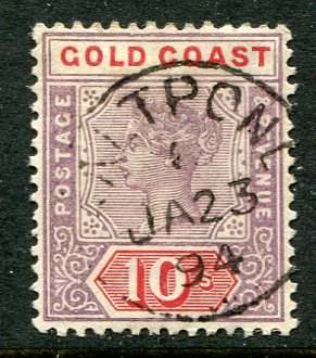 Gold Coast: 1889 (September). QV 10s wmk Crown CA struck by 23 January 1894 datestamp. Sg. 23
