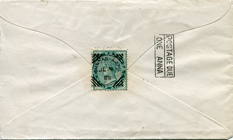 Indian Used Abroad – Iran: 1889 (9 July). Cover to Bushire franked with 1/2a India QV tied by Bandar-Abbas (type Z12) datestamp with inverted year slug variety and POSTAGE DUE / ONE ANNA handcachet. Cover underfranked 1/2a since the rate was 1a therefore charged double. Sg. Z53
