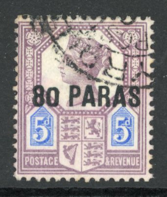 British Levant: 1890 (July). QV 5d. purple and blue surcharged in Turkish currency 80pa. with Small ‘0″ in ’80’ variety, used. Sg. 5a