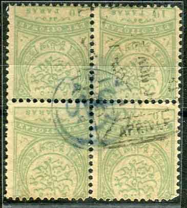 Ottoman Turkey: 1890 UPU Empire issue 10pa (isfila 136) block of four struck by BERGAMA (vilayet Ankara, A&P type 3) handstamp.