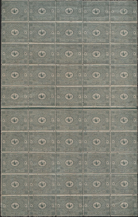 Ottoman Empire: 1890 Aid to Immigrants revenues 3pi green unmounted mint complete sheet of 50. Small faults. Suleymaniye 5023