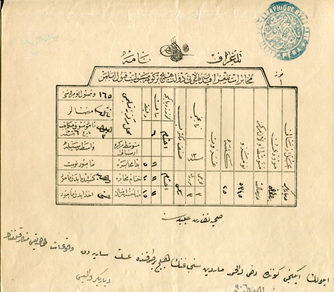 Ottoman Turkey: 1890 complete telegraph struck on arrival by BEYOGLU TELGRAF MERKEZI 1291 – SATION TELEGRAPHIQUE OTTOMANE PERA (vilayet Istanbul, A&P type 11) negative seal.