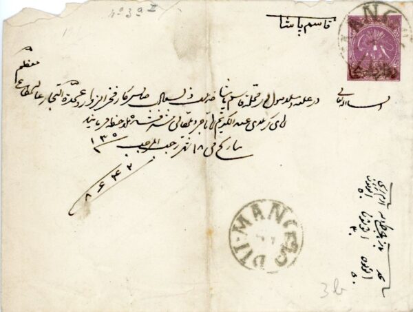 Iran: circa 1890 The Lion 12sh postal stationery envelope (145 x 111 mm) to Kasimpasa, Istanbul struck by DILMAN datestamps. Reverse Tauris transit and Constantinople-Galata arrival cds’s.
