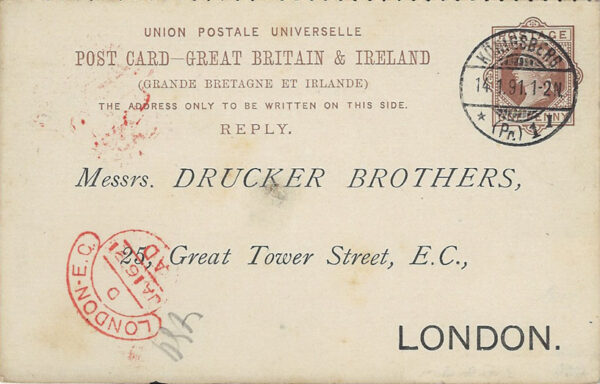 Great Britain: Reply Stationery: 1891 (14.1.) One Penny reply card from Konigsburg to London with arrival cds, card with printed address and manuscript message.