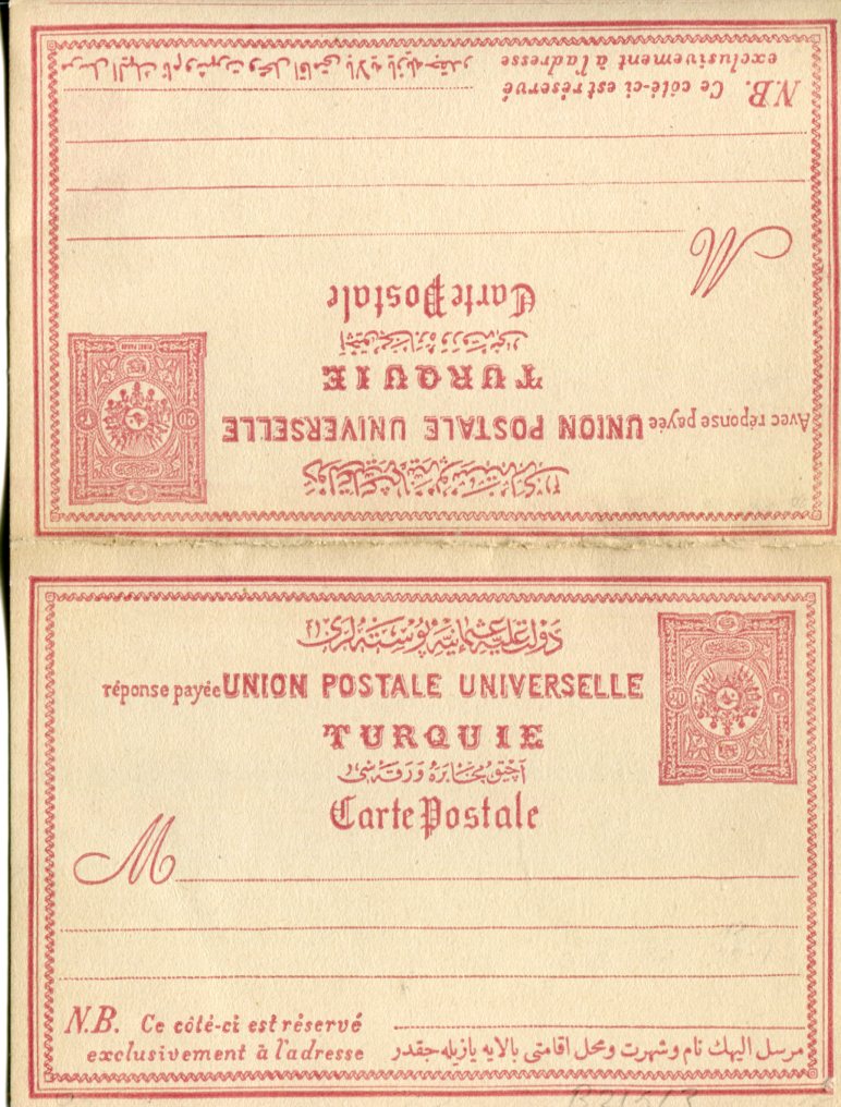 Turkey: 1892-98 unused 20pa coat of arms reply postal stationery card. Isfila AN30