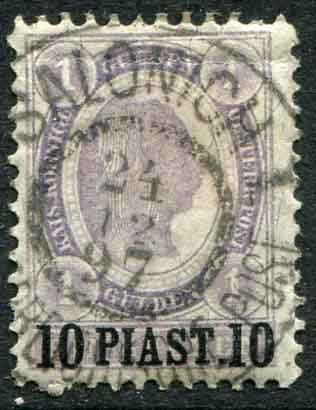 Austria Levant: 1896 (1 December). Surcharged stamps of Austria 10pi on 1g lilac struck with SALONICH I (Thessaloniki, Greece) 24.12.97 datestamp. Sg. 37