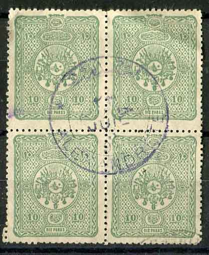 Ottoman Turkey: Block of four 10pa of 1892 coat of arms issue struck by superb ISKENDERUN – ALEXANDRETTE (A&P type 7) datestamp. Isfila 153