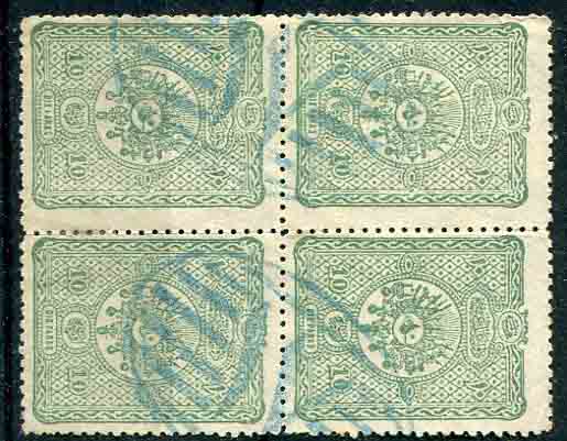 Ottoman Turkey: circa 1892 10pa coat of arms issue block of four struck by superb (Izmir Istasyon) 17 (vilayet Aydin, A&P type 532, R) handstamp.